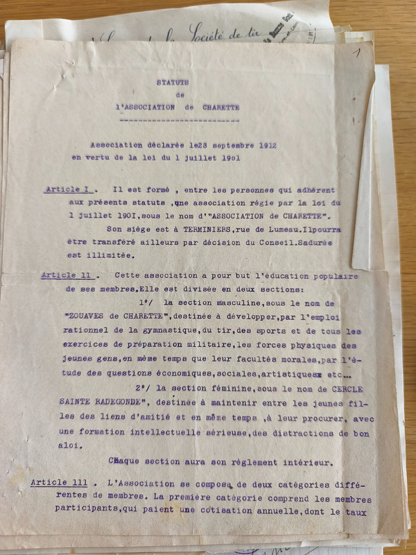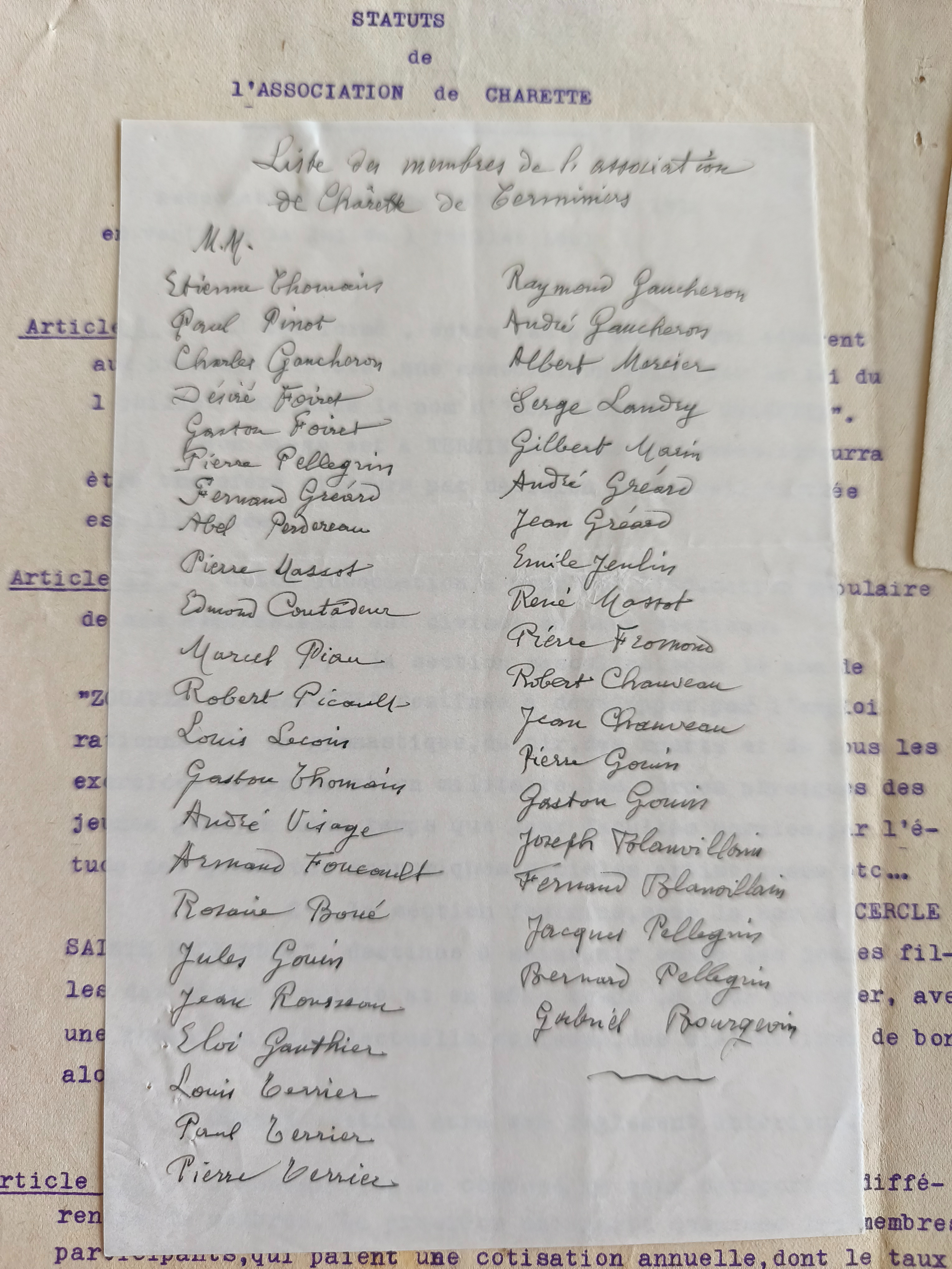- Le dossier comprends une lettre de Paul Pinot, Président de l'association, avec la liste des membres du comité directeur, la liste manuscrite des membres de de la structure et un extrait des statuts.